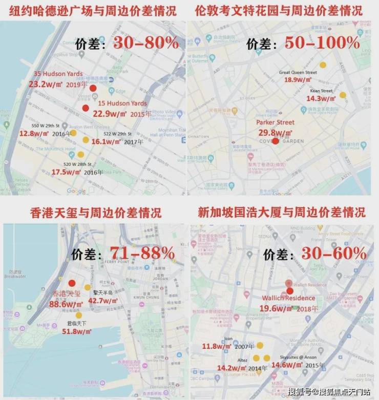 我们来看几个享誉全球的成功案例,纽约哈德逊广场,伦敦考文特花园,新加坡国浩大厦,香港天玺,这些顶级公寓都有一些共性点: