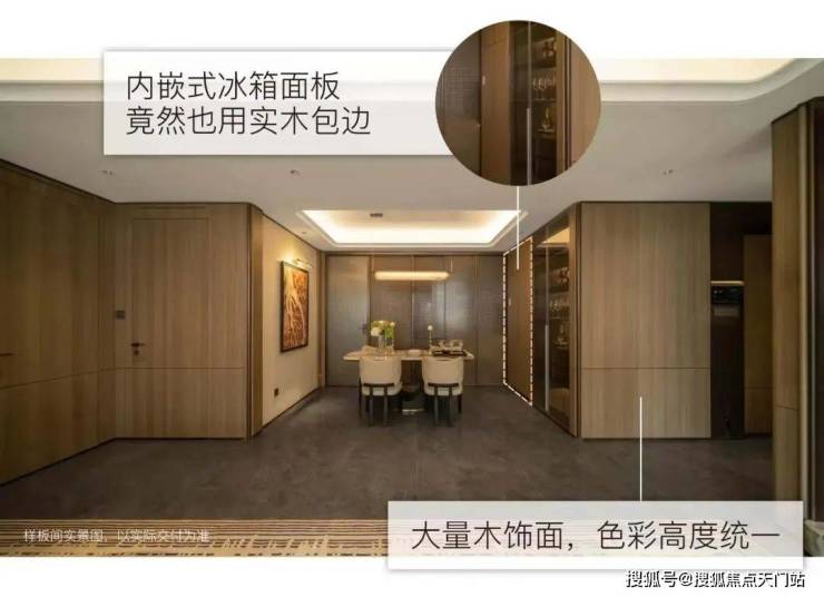 项目墙面铺设大量木饰面,相比墙布,更具质感更温馨。同时为了保持室内色调的统一,建面126㎡内嵌式冰箱的面板也采用木饰面。