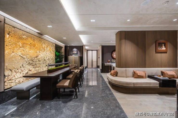 精致的迎宾水景、苍劲滴翠的罗汉松,为城市的界面,增添一抹亮色,也让当代年轻人,在享受现代都市生活的同时,感受到家的温暖和亲切。蓝翡翠的奢石,以深邃幽远的尊蓝色基底,尽显光彩下的神秘奢华;而顶部异形的仿铜星空顶设计,用香槟金色斜角造型铝板搭配熠熠灯光,碰撞出科技与艺术的美学。