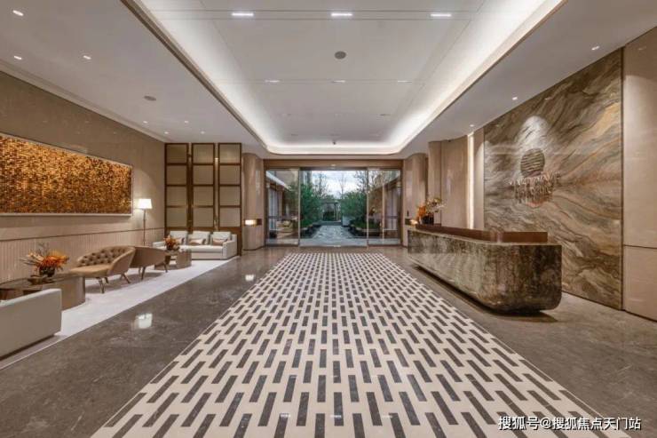迎宾大道的两侧,浅米色的仿石材景墙与大堂入口遥相呼应,纯净的质感、古铜色的装饰、简约的线条,搭配着酒店式的雅奢之境,创造出优雅、静谧又松弛的体验。而精致细腻的金属护栏、定制化的地面铺装、内嵌式的灯光照明等细节,将度假感、雅奢感和艺术感高度浓缩在每个日常生活场景中。