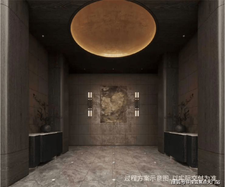 约50m面宽的气派门头+酒店式入户大堂,打造艺术格调归家。入户大堂由吴滨设计,呈现“天圆地方”的效果,方正的线条勾勒出空间的规整与大气,与顶部的圆形形成刚柔并济的视觉平衡,让每一次归家都成为一场尊贵的礼遇。