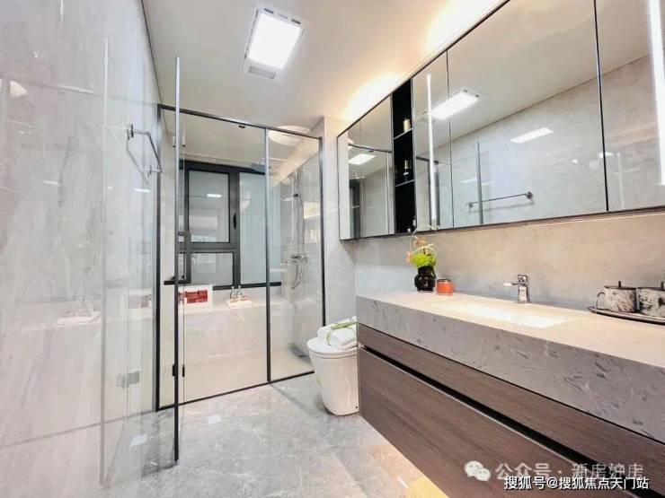 在细节上同样不遗余力。比如入户后的玄关柜是交付标准,打开厨房柜体、镜柜等各类收纳空间时均有惊喜;再如客厅和主卧均采用弧形吊顶,还有风暖浴霸、玄关顶面感应灯等细节,都透露出项目对品质生活的追求。