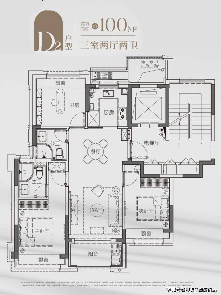 另一套建面约100㎡飞机户型,同样做了三房两卫,户型方正,几乎无过道设计,每一寸空间都没有浪费,舒适不局促。