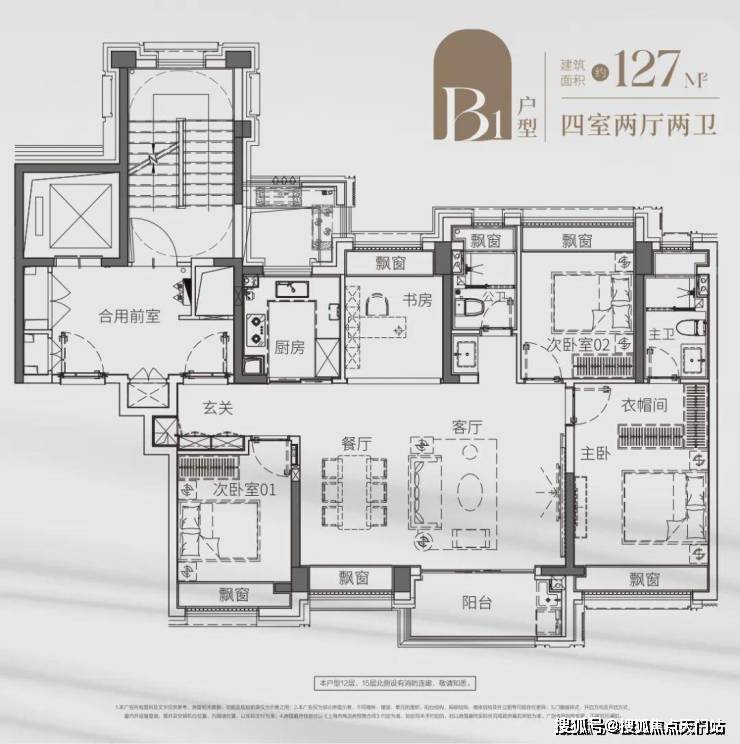 来看看更大一点的户型——建面约127㎡超阔四房,同样是南向横厅设计,并拉伸至4开间,空间舒阔。主卧套房设计,也有足够的收纳,打造专属秀场。