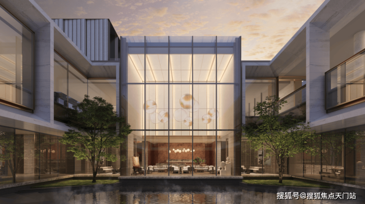 同时,部分采用 天青色釉面陶板,超扁平形制,同样搭配 大面幅落地Low-e三玻两腔玻璃,让建筑像是妙手剪裁的艺术品般行云流水,更大程度的为业主带来宽绰视野,体验摩登生活。