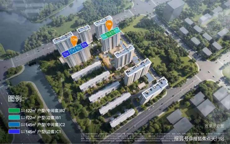 根据方案,项目拟建8栋16-17层高层住宅(含1栋17层保障房),以及5栋6层住宅,共计686户。小区人车分流;车位比约1:1.8,社区内部有水景、下沉式庭院。