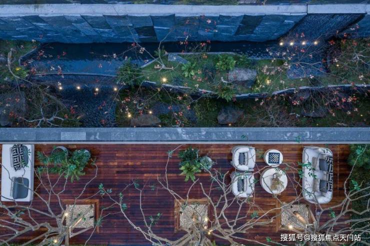 自【悬浮茶室】拾级而上,在【思韵书院】外,一处闲憩放空的【阅川水岸】至此呈现,脚下溪流自脚下蜿蜒而过;眼前,是幻影蓝奢石池底的幽邃微光。一株来自地中海的油橄榄,与一棵百年老桩紫薇在此相望。