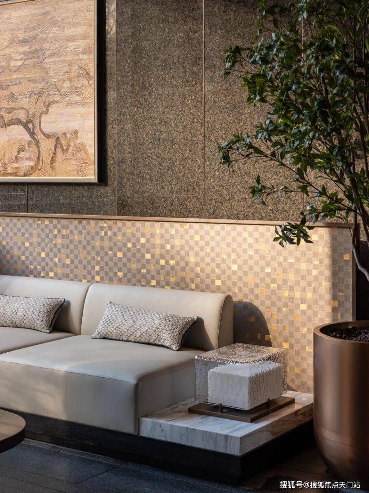 黄金丝绸大理石流转着真丝般的光泽,白玉与卡里冰玉小台映照天光云影。