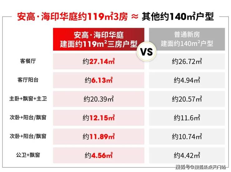 安高·海印华庭建面约119m²大三房的室内空间与常规新房建面约 140m²左右的大三房相比, 客餐厅、客厅阳台、两个次卧和公卫的空间都更大