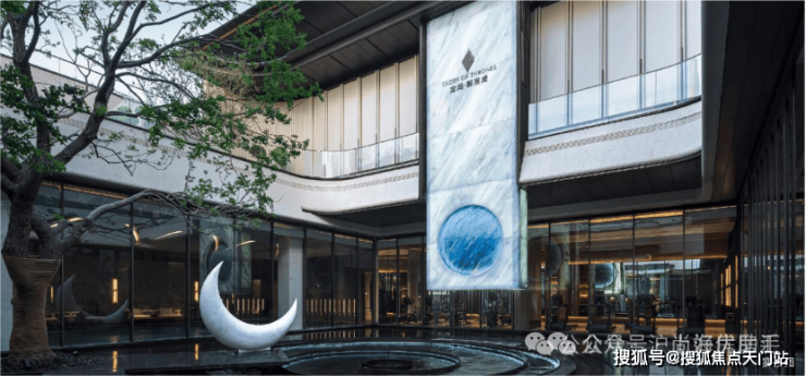 深藏于建筑怀抱之中的下沉式「琉璃光院」,是历经数十版方案淬炼出的灵魂之作。御湖境标志性汉白玉玄月族徽,与高10米的蓝水晶奢石光幕,共同演绎“日月同辉”的震撼场景。庭院深处50年乌桕树王矗立。