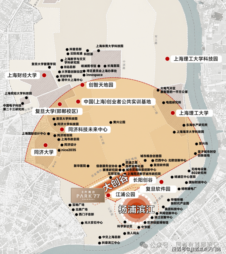 同时,保利外滩启PARK77独据杨浦滨江科创扇面启点(江浦公园站),5km创新半径内,无论高校资源富集度、产业创新浓度,还是人才密度皆为上海最高:百年复旦、巍峨同济、上海理工3大顶尖高校,在此如群星汇聚;7家国家大学科技园、100余所科研机构、1200多家国家高新技术企业,在此星罗棋布,数量位居上海全市前列;国家级创新引擎——长阳创谷,集聚小红书、得物、福特汽车、同济数字研究院等巨头,百度创新中心、埃森哲AI实验室、赢彻科技等人工智能企业;大连路总部研发集聚区,吸引了西门子、大陆集团、李尔亚太等近1700家企业入驻。