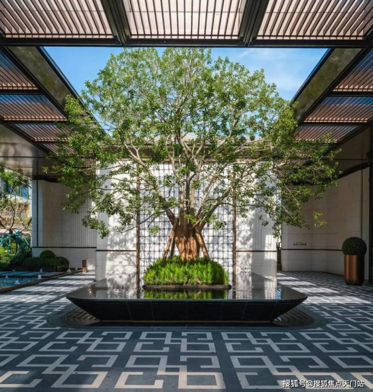 社区入口, 百米酒店式落客门庭 、超 60年树龄铁冬青打造的“ 大树聚场 ”、潘多拉发光奢石拼花的 “ 躺平水院 ”,是家人休憩、邻里小聚的好去处;