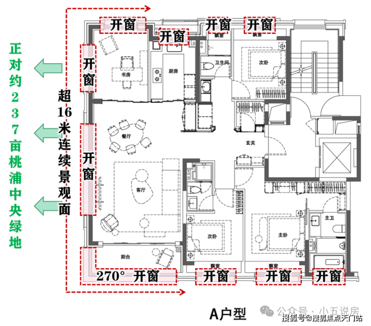 北-东-南3面景观!270°无界景观阳台!超16米连续西向景观面!西侧整块玻璃约8.2㎡!高区部分房源视野延伸近6公里!