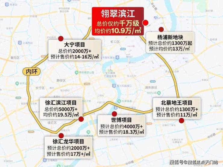 首先,中粮瑞虹海景壹号位于内环内,目前的挂牌均价约17.2万/㎡,最低挂牌总价约2399万,几乎是翎翠滨江的两倍有余。