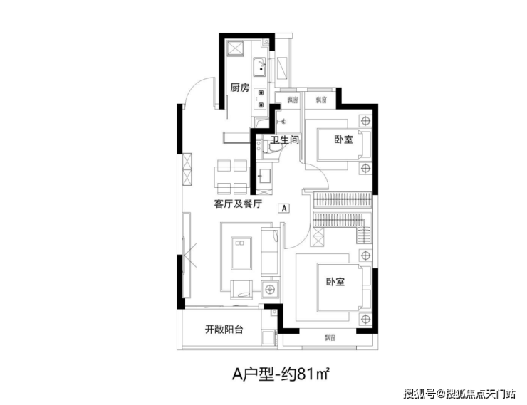 建面约81㎡2房功能齐全,拥有朝南大面宽和全卧飘窗设计。