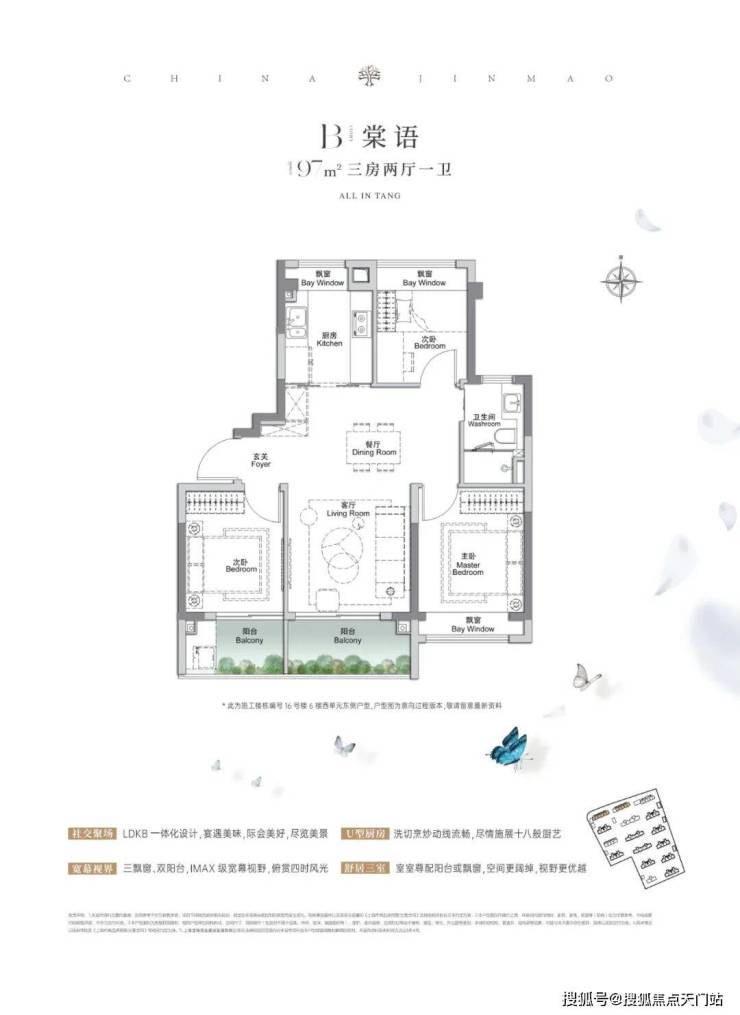 建面约105、117㎡3房2厅2卫,空间布局非常相似,都做到了三开间朝南+多个飘窗+主卧套房设计+270°转角飘窗。