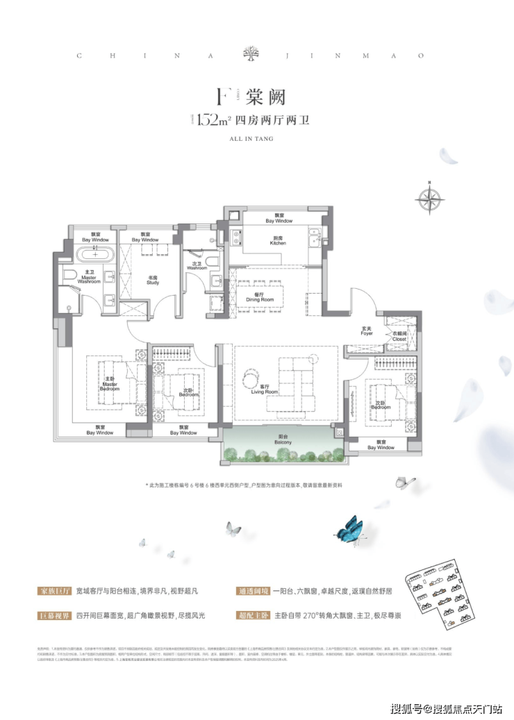 建面约137、152㎡4房2厅2卫,空间布局非常相似,都做到了四开间朝南+入户玄关+6个飘窗+主卧套房设计,所有空间的尺度一步到位。