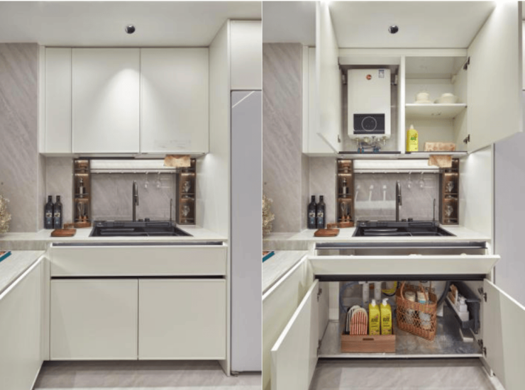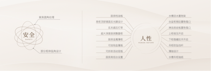 譬如说部分柜体更安全的圆角处理、高柜顶部一窥到底的镜面反光膜、大大提高空间利用的薄抽,不用弯腰一踢即开的踢脚抽设计,便利性大大增加;