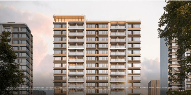 蓝灰色玻璃+仿石铝板+艺术涂料材质,穿插优雅线条,让建筑这张“脸”看起来更高级。One&Only酒店式门头。用雕塑体块、温润弧面和雅致线条,营造具有艺术格调的归家仪式感。