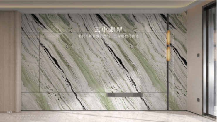 充分考虑业主的个性化需求,在电视背景板提供了新潘多拉、云中翡翠、弗朗明戈金三种结晶釉面岩板选择,成本更高,施工难度也更大。
