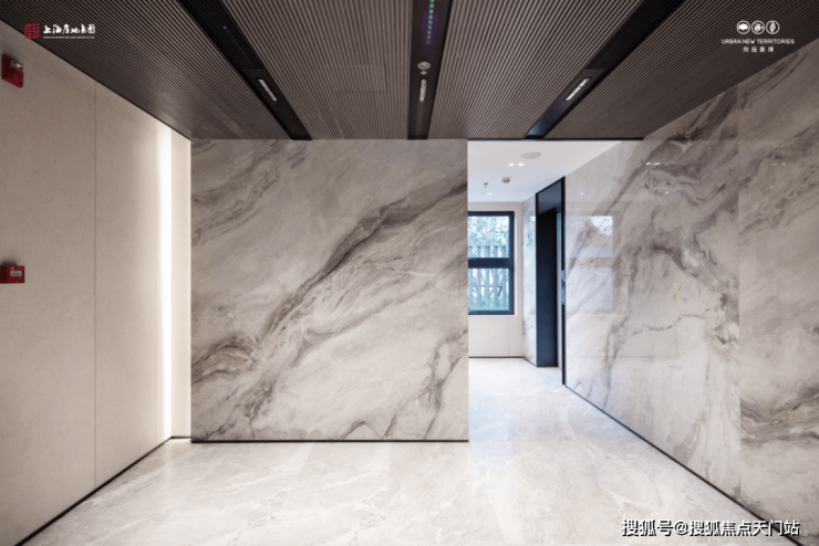 一楼电梯厅墙面铺设大面积岩板,吊顶也颇具设计感。