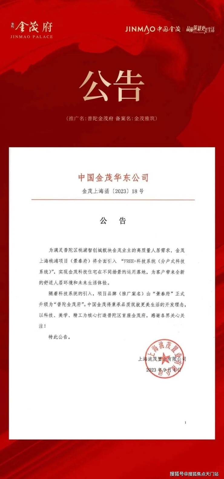 2023年9月4日,中国金茂华东公司发布一则公告: 金茂上海桃浦项目(景泰府)更名为普陀金茂府。