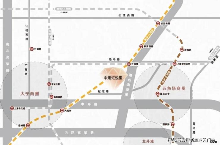 轨交配套:中建·虹悦里直线距离3号线大柏树站约750米,直线距离江湾镇站均约900米,步行可及。3号线也是多年才出一个轨交房。畅联中山公园/延安西路;三重高架:临近中环高架/逸仙高架及大柏树立交,迅捷衔接五角场/大宁等地;干道交通:周边汇聚逸仙路/汶水路/中山北路等城市主干道,便捷抵达全城。