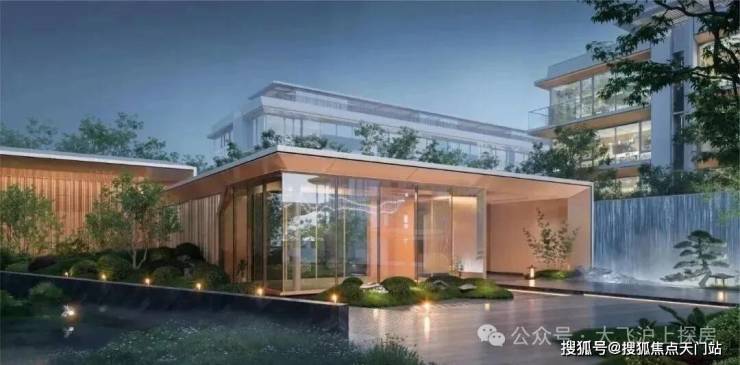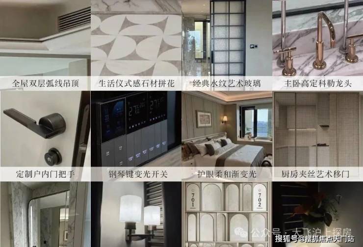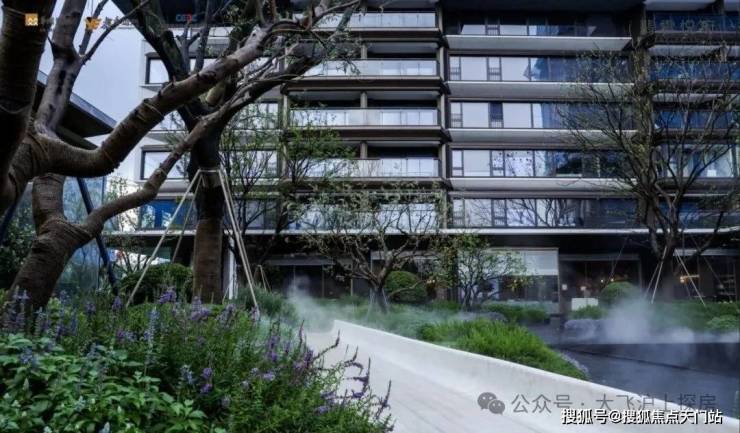 入口处选用了大面积 冰裂琥珀釉陶板,背后的工序非常复杂,从选材到运输,最后拼接,每个环节都是高成本和高技的工艺工法。水晶景观庭院在动与静之间,细节到了流水、园林里,值得一提的是 ,庭院里的水,并不是静态,而是有涟漪的流动,同时为了保证低区业主不被流水声音干扰,特意做了“静音水”。这一现象的背后,是1300多块安哥拉石材的切割与拼接,完全是把细节拉满。