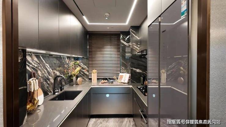 U型厨房,借了一部分飘窗因此纵深较长,但面宽相较于同面积段产品来说还是小了点。油烟机、燃气灶、烤箱和15件套洗碗机均为博世(或同等品牌);冰箱西门子双开门冰箱(或同等品牌),105㎡是单开门冰箱;水槽和龙头都是铂浪高(或同等品牌),还有康丽根(或同等品牌)净水器。