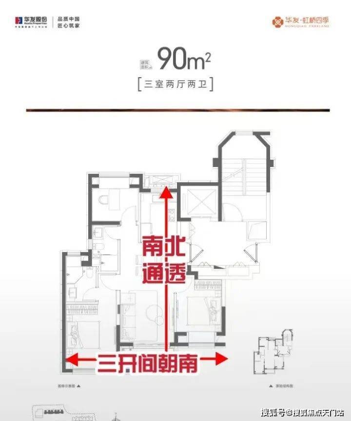 建面约90㎡户型的总价段在 400-480万之间, 不到500万上车大虹桥一套地铁品质3房! 飞机户型+三开间朝南+南北通 的流行设计,格局方正,挑不出任何毛病。
