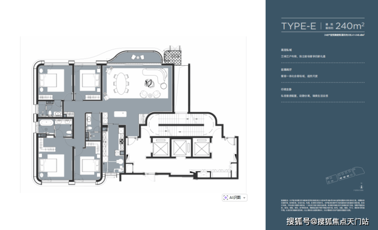 建面约240㎡户型,南北双套房设计兼顾代际需求,让每个家庭成员都能拥有独立静谧的奢居体验。