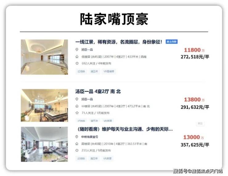 上海本土顶豪中,汤臣一品(陆家嘴)高区江景二手房 27-30万/㎡,中粮海景壹号一线江景 20-35万/㎡,绿城黄浦湾(外滩)一线江景 24-33.6万/㎡。