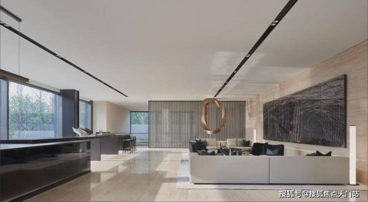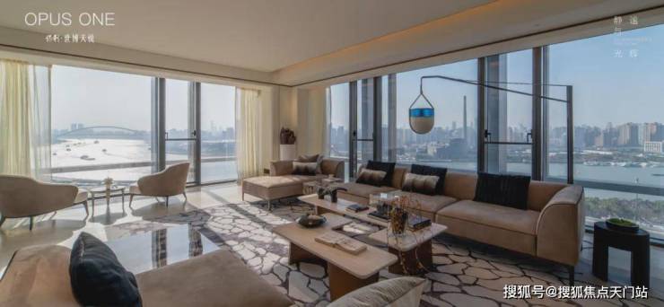 这客厅既是270°全景舱厅,无论全家在餐桌前欢聚一堂,还是孩子们在客厅嬉戏,一抬头便是以江景和城市为主题的巨幅油画。