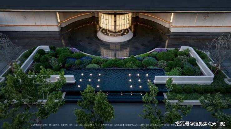 下沉式庭院,通过垂直景墙、悬浮观景台与叠水景观的立体交织, 实现移步换景的视觉效果,也与会所空间形成无界交互。