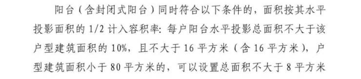 通知明确: 阳台面积最大面积为户型建面的10%,且不大于16平,计一半面积,同时适用于封闭式阳台。局部地区,可增加一个进深0.75米宽3米的阳台,不计入容积率和可售面积。