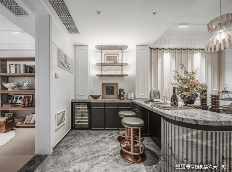 更好更奢的归家门庭,嘉佩乐酒店风格,海派元素充满空间的每一个角落,地面的复古花纹,金属镂空装饰墙,普拉达绿的奢石点缀,仿佛穿越到了摩登时代。