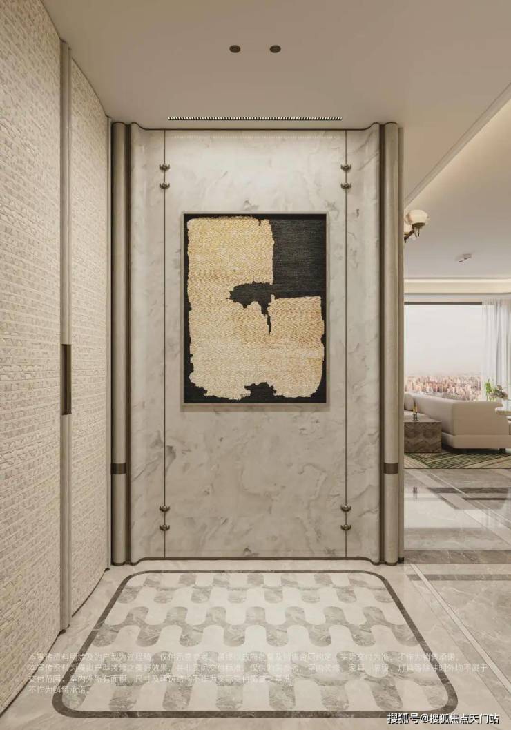 在更高配的面积段里,这种“讲究”继续升级:玄关同样带全水刀石材拼花,主卧背景墙采用石材+小翻边设计,双重石材手工粘贴打磨,光影层次更丰富;
