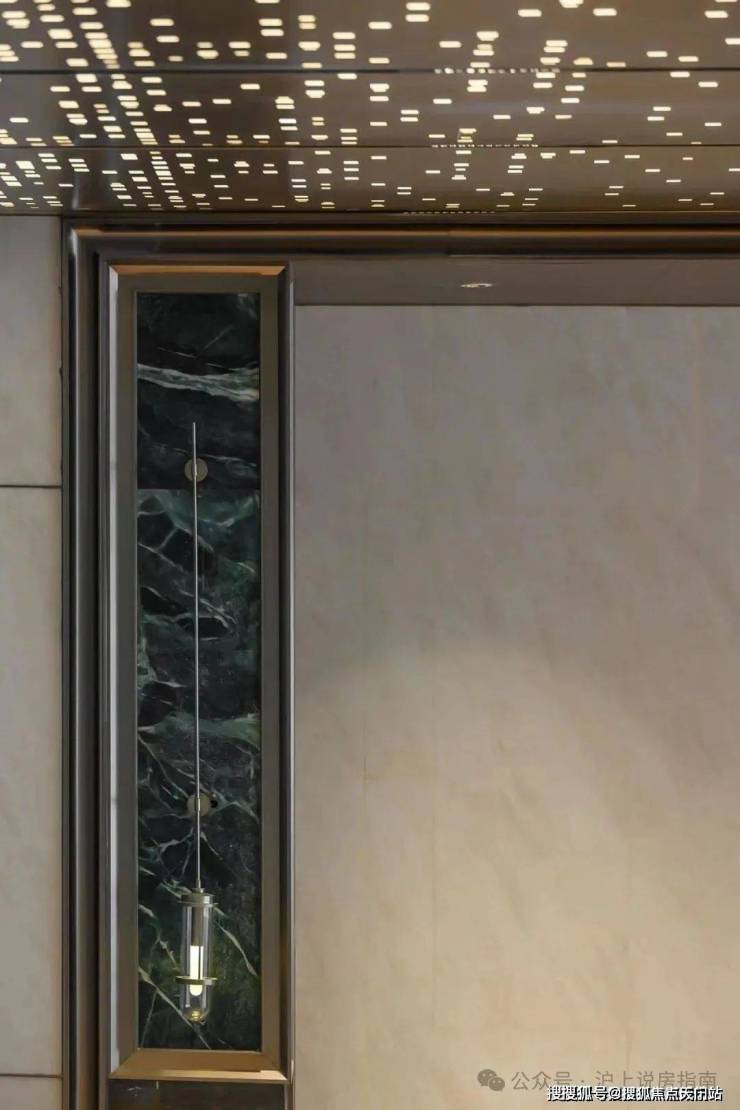 架空层入户门厅处,以普拉达绿奢石为背景装饰,提升了整体空间的质感,结合金属铝板装饰搭配,归家仪式感满满。