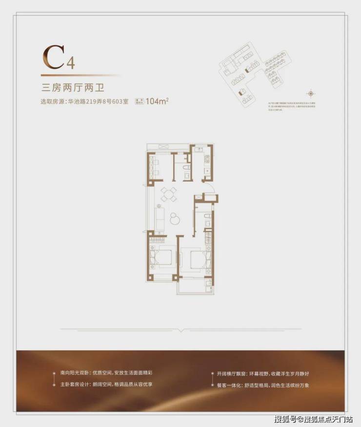 建面约104㎡的户型,能满足从二人世界到二胎生活的全生命周期需求,并且整体2-3开间朝南+客厅宽面阳台,整体的南向采光,视野以及尺度感很优秀,并不会感觉局促。
