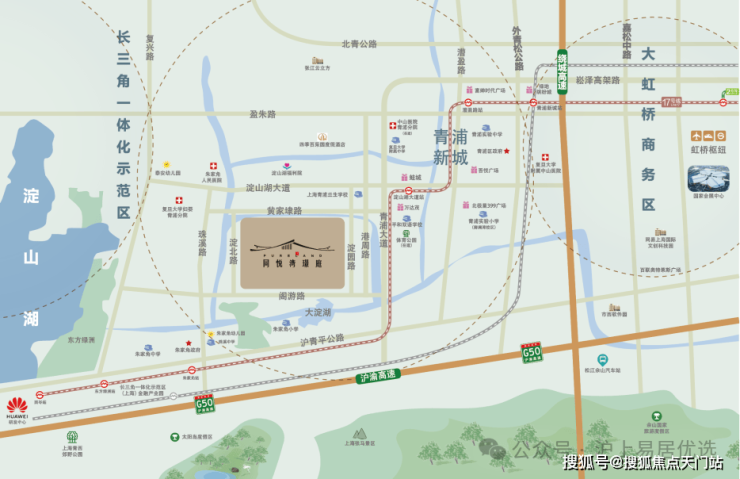项目与17号线淀山湖大道站直线距离约2.5公里,通过17号线可直达虹桥商务区,并且能无缝换乘2/10号线,快速接驳上海市中心。