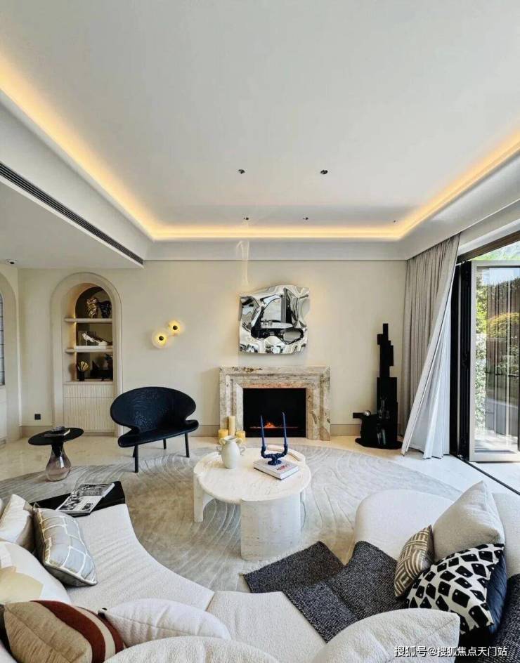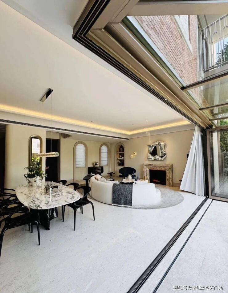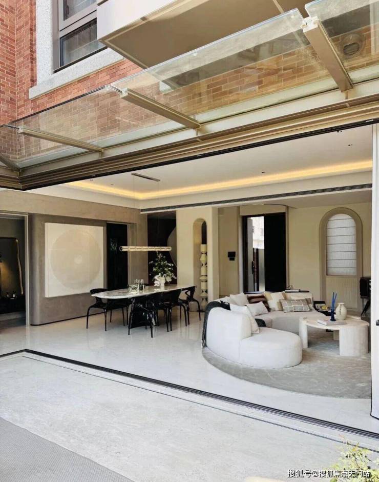 「无界空间」:客厅270度转角无柱设计,搭配落地玻璃,开阔视野将院中风景迎入日常。