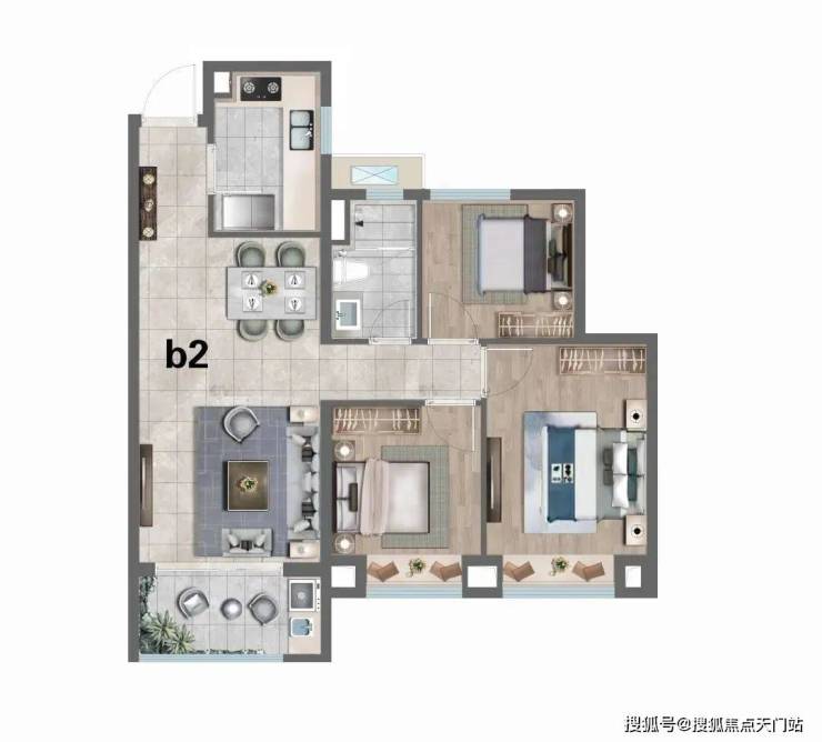 建面约91㎡三房两厅一卫 ,三开间朝南+双朝南卧室带飘窗+动静分离,是一个采光面十足的小3房户型。