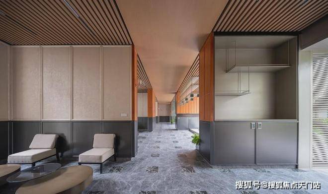 同时,社区内部景观打造了大面积的叠级水景,搭配普拉达绿大理石和浪淘沙石材,呈现整体空间的隐奢基调。