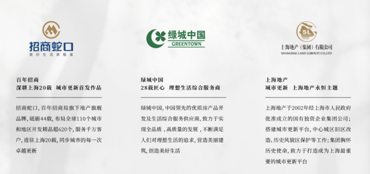 开发商: 招商蛇口携手绿城中国、上海地产,于世界级会客厅北外滩合著内环内罕见的121席里弄风貌大宅,打造市区1.1容积率低密居住空间,传承海派衣钵。