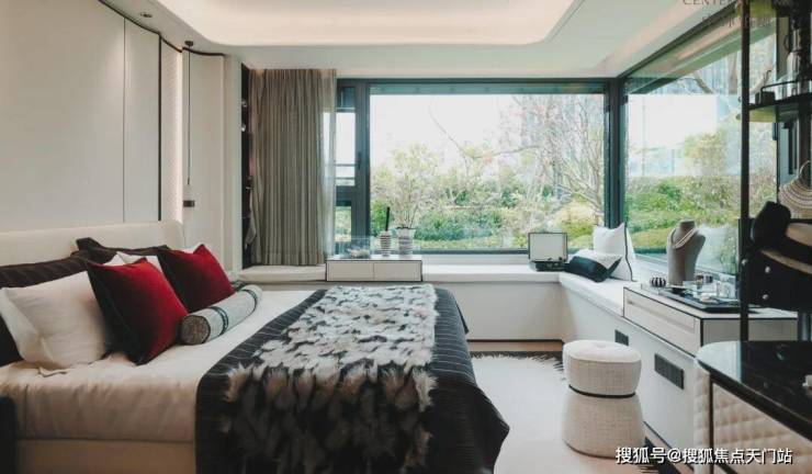 主卧270°转角飘窗设计! 开间约3.4米,进深约4.5米,即便放下2米宽大床,依旧宽敞阔绰!