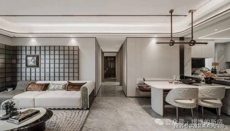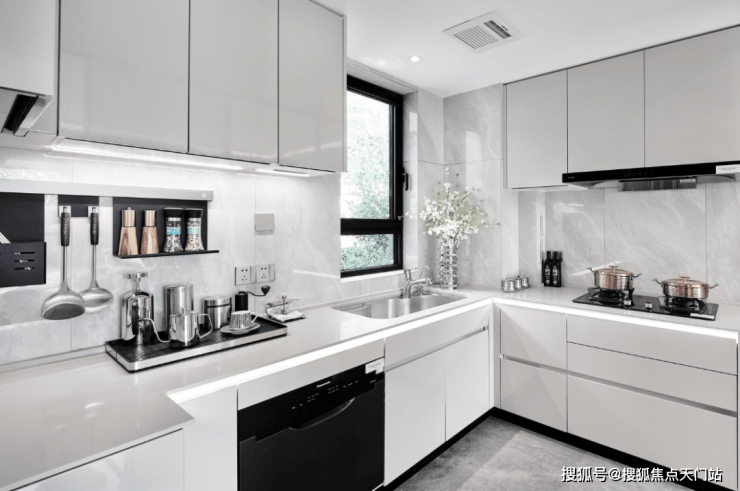 餐客厅踢脚线和厨房门框均为金属材质, 开关面板全部定制同色系,把房屋美学做到极致……