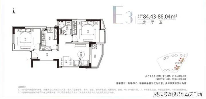 建面约78-91.22平米的小户型,两房两厅一卫的格局,非常适合年轻刚需家庭上车。