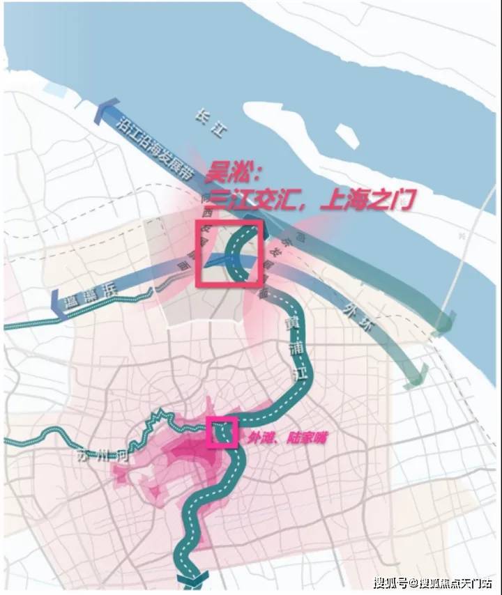 大吴淞地区整体的规划框架是要打造一个标志的 “三江交汇” 的上海之门,也就是三长江、黄浦江和蕰藻浜。这三江都是具有通航能力的河道,除了能够提供独特的景观价值之外,还能为产业提供很好的航运条件。