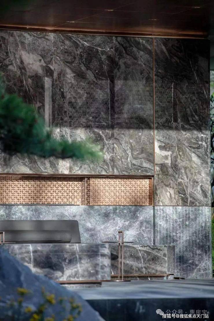 位于社区中央的第二景观会客厅聆星客厅,立面装饰有极具典藏价值的 威尼斯棕奢石、吊顶采 用铝板切割镶嵌、地面采用 阿尔卑斯灰和 福鼎黑拼花铺装。