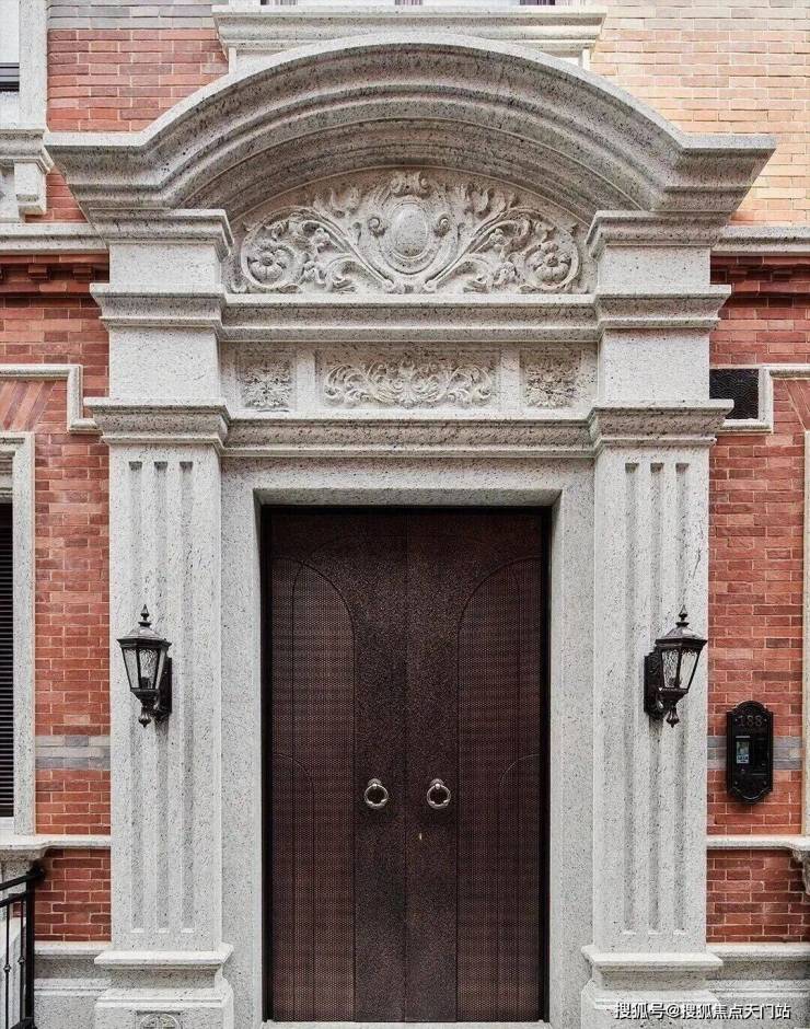 定制级山花造型,取材珍稀玫瑰金麻花岗岩,在坚硬的石面之上,勾勒出层层叠叠的雕花肌理;
